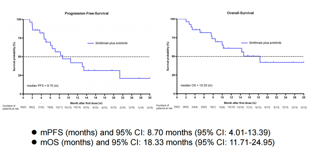 截至2024年6月底,共入组28例患者,中位年龄为60.3岁(范围36-74岁),57.1%为男性,所有患者均为Child-Pugh A级。26/28例患者(92.9%)为TNM IIIb/IV期,11/28例患者(39.3%)有远处转移。所有患者均进行了疗效评估。确认的ORR为42.9%,DCR为85.7%。其中,7.1%(2/28)的患者达到完全缓解(CR),35.7%(10/28)的患者达到部分缓解(PR)。中位PFS为8.70个月(95%CI:4.01-13.39),中位OS为18.33个月(95%CI:11.71-24.95)。其中,7例(25.0%)患者进一步接受了手术切除,其中4例在最后一次随访时仍保持无瘤生存。23/28例患者(82.1%)发生治疗相关不良事件(TRAEs),最常见的是高血压,发生率为57.1%。9/28例患者(32.1%)发生3级TRAEs,无4-5级TRAEs发生。