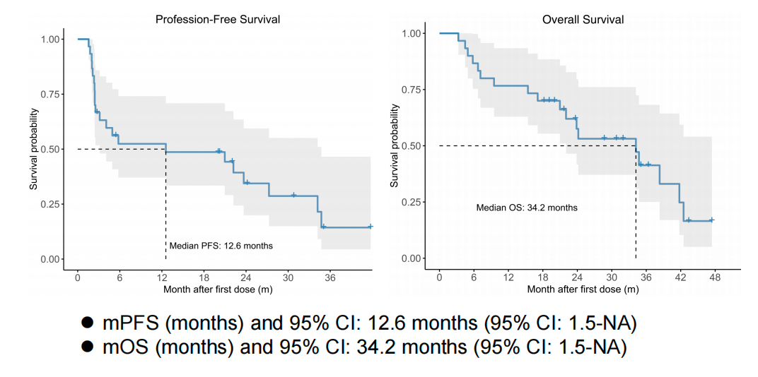 截至2024年6月24日,共入组30例患者,中位年龄为60.5岁(范围42-75岁),86.7%为男性,所有患者均为Child-Pugh A级。中位随访时间为22.9个月(3.3-47.4)。根据中国肝癌分期(CNLC),Ib、IIa、IIb、IIIa和IIIb期的患者分别占23.3%、20.0%、23.3%、30.0%和3.3%。在所有患者中,6例(6/30,20.0%)有远处转移,8例(8/30,26.7%)有门静脉癌栓(PVTT),3例(3/30,10.0%)有肝静脉侵犯。ORR为46.7%(14/30),DCR为53.3%(16/30)。在所有患者中,4例(4/30,13.3%)达到完全缓解(CR),10例(10/30,33.3%)达到部分缓解(PR)。中位DOR为3.4个月(95%CI:1.2-29.4)。中位PFS为22.0个月(95%CI:1.5-44.4),中位OS为34.2个月(95%CI:20.7-47.7)。接受治疗后,7例患者(7/30,23.3%)接受了手术切除,其中5例(5/7,71.4%)患者术后复发。接受手术患者的中位PFS为20.2个月(95%CI:2.2-23.0)。在治疗期间,6例患者(6/30,20.0%)因不良事件(AEs)而退出。治疗相关不良事件(TRAEs)发生在29/30例患者(96.7%)中。1-2级TRAEs发生在28/30例患者(93.3%)中,3级TRAEs发生在13/30例患者(43.3%)中,无4-5级TRAEs发生。