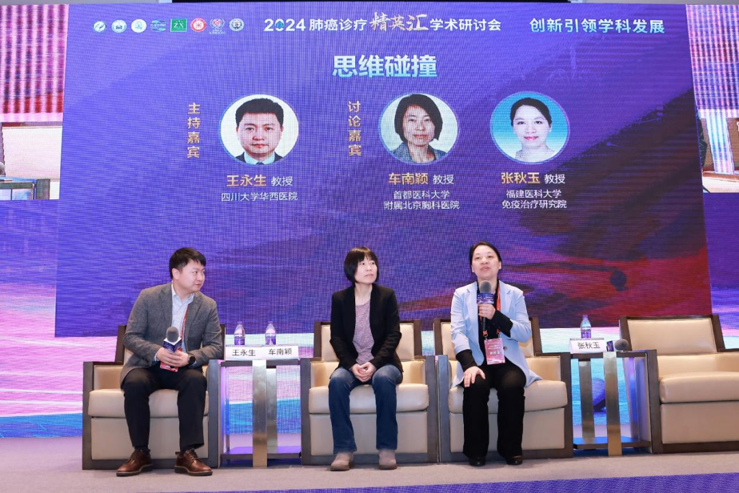 思维碰撞环节,四川大学华西医院王永生教授主持下,首都医科大学附属北京胸科医院车南颖教授、福建医科大学免疫治疗研究院张秋玉教授参与讨论。