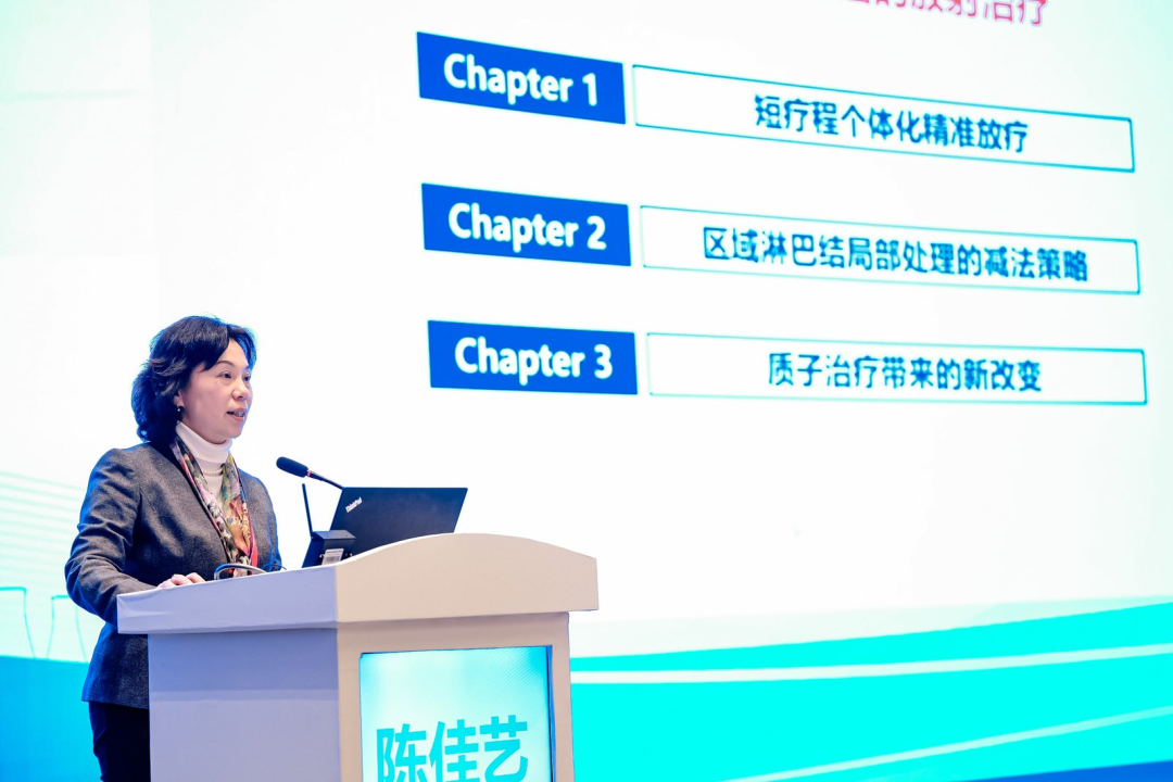 上海交通大学医学院附属瑞金医院陈佳艺教授做出了“乳腺癌放射治疗进展”的讲课并分享了其中心的研究成果。此外,她还探讨了早期乳腺癌短程/超短程放疗的探索进展,她表示,短程和超短程放疗的探索仍是乳腺癌现代放疗的主旋律,更多研究结果的公布使我们有更多信心将短程放疗拓展至更广泛人群(RNI,重建术后,瘤床加量)和更精准的技术(质子治疗)。陈教授还提到,多基因模型与传统临床病理预后因素的结合正持续优化包括放疗在内的局部治疗策略。在区域淋巴结局部处理方面,她指出治疗策略正迈向“轻时代”,放疗的重要性日益凸显,并聚焦器官亚结构特征以降低副作用。讲课最后,陈教授还分享了乳腺癌质子治疗的当前需求及瑞金医院的数据,为质子治疗的应用提供了更多经验。