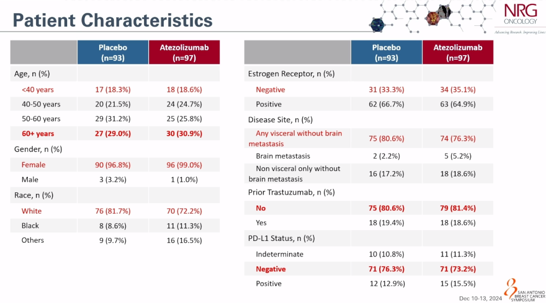 NRG-BR004试验:一项评估紫杉醇/曲妥珠单抗/帕妥珠单抗联合阿替利珠单抗或安慰剂一线治疗HER2阳性mBC疗效的随机、双盲、III期研究。