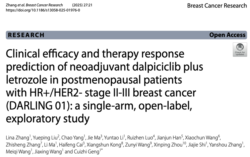 2、Zhang,Lina et al.“Clinical efficacy and therapy response prediction of neoadjuvant dalpiciclib plus letrozole in postmenopausal patients with HR+/HER2-stage II-III breast cancer(DARLING 01):a single-arm,open-label,exploratory study.”Breast cancer research:BCR vol.27,1 21.13 Feb.2025,doi:10.1186/s13058-025-01976-0