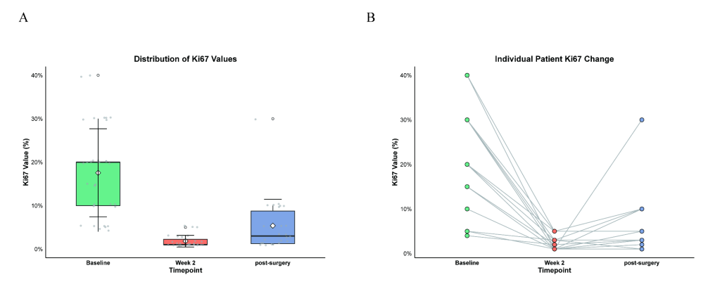 治疗2周后,Ki-67平均表达较基线水平显著下降(从17.5降至1.8%),75%的患者出现CCCA。