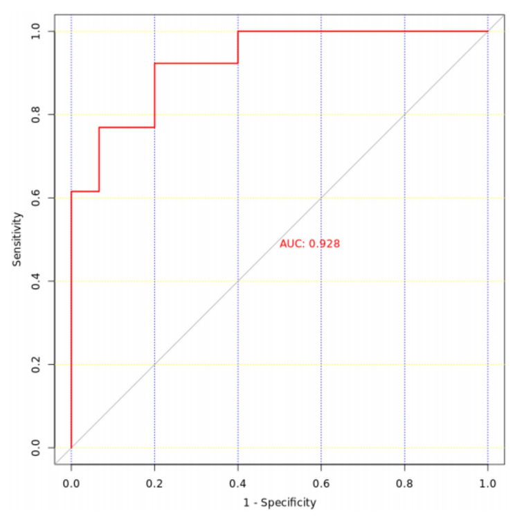 △预测模型的性能。绘制受试者工作特征曲线(ROC曲线),AUC为0.928。