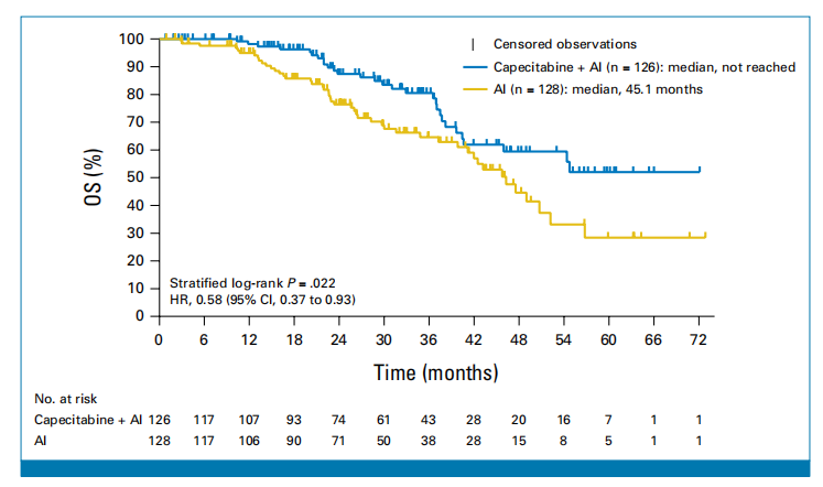 节拍卡培他滨+AI治疗组的中位OS未达到,而单药AI组为45.1个月(HR,0.58;95%CI:0.37~0.93)。