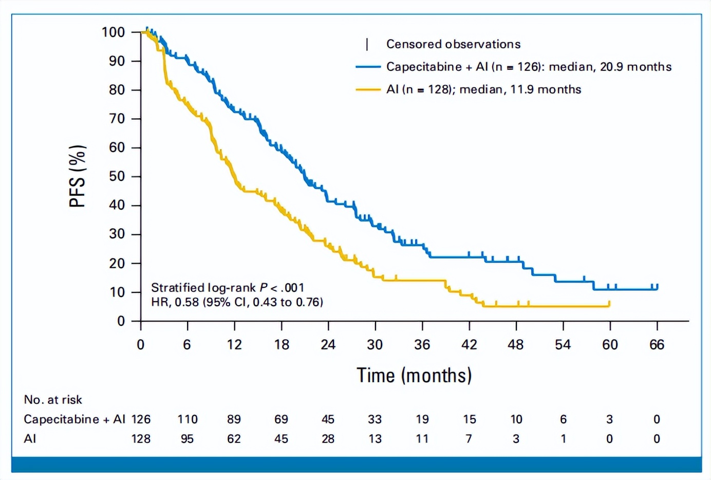 研究结果:共263例患者被随机分配,其中254例患者构成了全分析集。中位随访时间50.7个月时,发生了203例PFS事件。节拍卡培他滨+AI组的中位PFS为20.9个月,而单药AI组为11.9个月(HR,0.58;95%CI:0.43~0.76)。