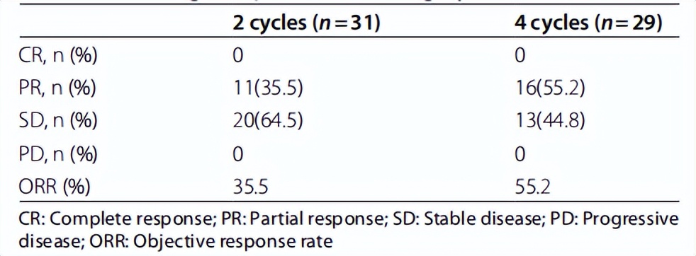研究结果:该研究共纳入35例患者,31例完成全程治疗。29例患者在治疗4个周期后可评估治疗疗效,其中16例获得部分缓解(PR),ORR为55.2%。