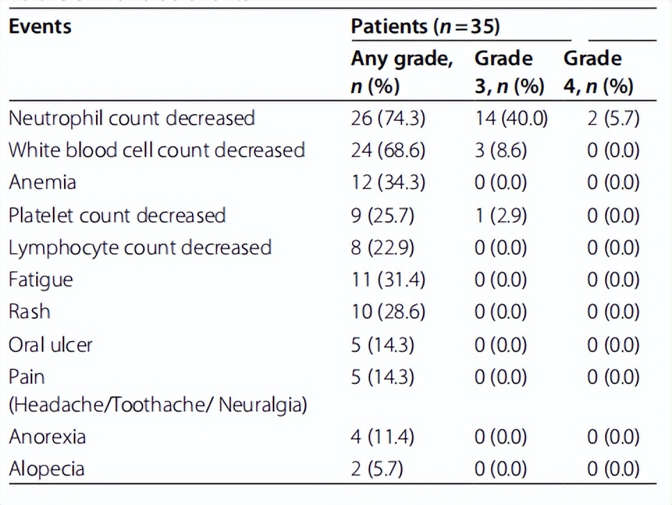 ≥3级不良反应主要为中性粒细胞减少(45.7%),中位持续时间为3天。