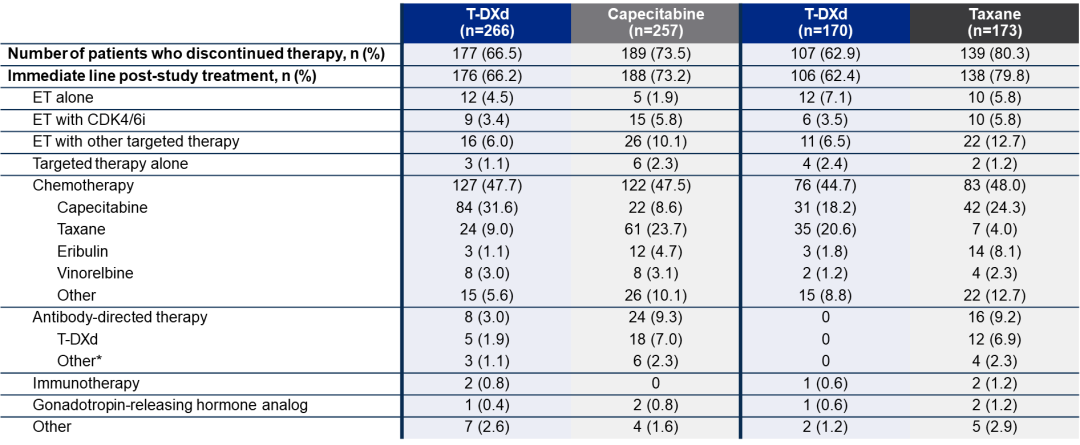 接受后续治疗的患者中,约一半的患者选择了化疗方案,少数患者选择内分泌治疗、靶向治疗或者其它ADC治疗,其中卡培他滨和紫杉类治疗患者分别有9.3%和9.2%接受了ADC后续治疗(图4)。