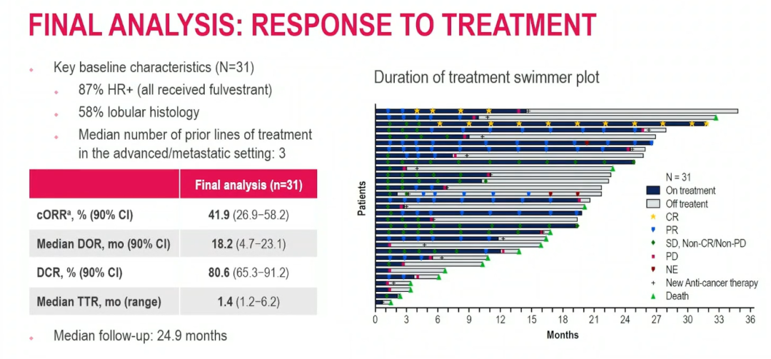 截至2024年11月22日,共31例患者接受治疗,其中87%为HR+,58%为小叶癌。患者既往接受的全身中位治疗线数为3线(LA/MBC)。中位随访时间为24.9个月。cORR为41.9%(90%CI:26.9~58.2),包括2例完全缓解和11例部分缓解。mDOR为18.2个月(90%CI:4.7~23.1)。