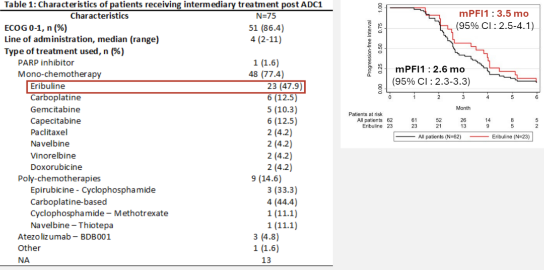 T-DXd和SG的载荷均为拓扑异构酶I(TOPO1)抑制剂,靶点分别为HER2和TROP-2。理论上,如果不存在TOPO1相关的耐药性,T-DXd和SG的序贯使用仍然有效。本次ESMO BC大会报道了另一项来自法国的回顾性研究[9],纳入了179例接受T-DXd或戈沙妥珠单抗(SG)治疗的HER2低表达mBC患者。研究结果显示,这两种ADC序贯治疗患者的疗效有限,总体人群的mFPS2仅为2.7个月。值得注意的是:早期(≤3线)使用第二种ADC(ADC2)的mPFS2仅为3.1个月,和延迟(3线以后)使用ADC2(2.6个月)仅相差0.5个月,且早期使用ADC2的原发耐药率高达55.9%;此外,有62例患者明确中间使用了其他治疗药物,总体的中位无进展间隔期(mPFI)为2.6个月,其中艾立布林治疗患者的中位PFI1为3.5个月。这些结果表明不同ADC序贯治疗需注意靶点丢失或载荷耐药问题,间隔使用其他机制的药物似乎有助于改善生存预后。