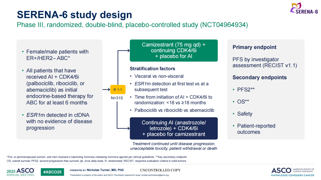 郭宝良教授:SERENA-6是一项III期双盲、随机研究,旨在评估Camizestrant与CDK4/6抑制剂(包括哌柏西利、瑞波西利、阿贝西利)联合治疗相较于AI与CDK4/6抑制剂联合治疗在疾病进展之前出现ESR1突变(ESR1m)的HR+/HER2-晚期乳腺癌中的疗效和安全性。研究共纳入3256例已接受至少6个月一线AI(阿那曲唑/来曲唑)+CDK4/6抑制剂治疗的HR+/HER2-晚期乳腺癌患者,每2-3个月进行一次ctDNA检测以筛查ESR1m,并与常规影像学检查同步进行。