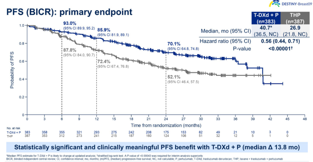 在中位随访29.0个月后,通过盲法独立中央评审(BICR)评估的中位PFS,T-DXd联合帕妥珠单抗组达到40.7个月,而THP组为26.9个月,PFS显著改善了13.8个月。两组之间的差异转化为T-DXd联合帕妥珠单抗方案使疾病进展或死亡风险降低44%(HR 0.56,95%CI:0.44-0.71;P<0.00001)。