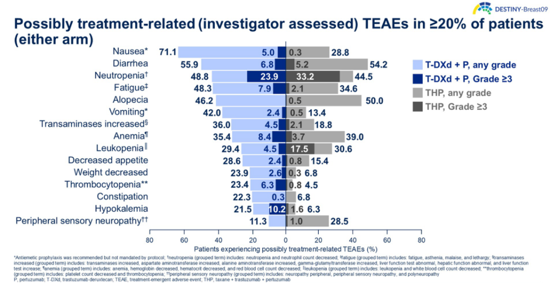 DESTINY-Breast09包含两个主要终点,即通过盲法独立中央评审评估的PFS:一个比较T-DXd联合帕妥珠单抗与THP,另一个比较T-DXd单药与THP。目前仍在继续收集数据,以评估T-DXd与THP的另一个主要PFS终点,以及所有治疗组的关键次要终点——总生存期。