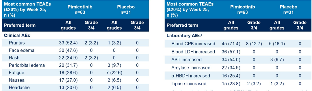 在安全性方面,Pimicotinib基本上是可控、可耐受的。Pimicotinib组和安慰剂组的严重治疗期间不良事件(TEAEs)发生率分别为4.8%和3.2%,Pimicotinib组的减剂量和停药TEAEs仅分别为7.9%和1.6%。Pimicotinib较为常见的3/4级TEAE为疲劳(22.6%)、肌酸激酶升高(12.7%),没有发生胆汁淤积、肝酶升高等肝毒性事件。