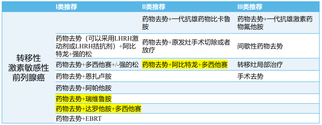 CACA-PC指南强调了内分泌治疗的基石作用,对于mHSPC患者不反对单独使用ADT,但是更加倾向ADT联合其他治疗。CACA-PC指南纳入了更多基于中国人群的循证医学证据,包括纳入了中国患者的ARASENS研究(ADT+多西他赛+达罗他胺)、CHART研究(ADT+瑞维鲁胺),均带来了显著的OS获益。此外,ADT+多西他赛+阿比特龙的PEACE-1研究也显示了同时对低或高瘤负荷患者的rPFS获益。