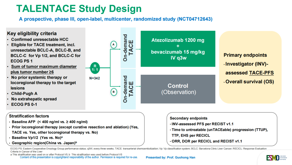Jiahong Dong, Guohong Han, et al. TALENTACE: A phase III, open-label, randomized study of on-demand transarterial chemoembolization (TACE) combined with atezolizumab + bevacizumab (Atezo+Bev) or on-demand TACE alone in patients with systemically untreated, intermediate-to-high burden unresectable hepatocellular carcinoma (uHCC). ESMO GI 2025 Abstract: LBA2