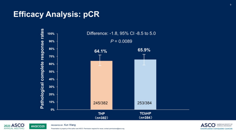 HELEN-006研究显示,白蛋白紫杉醇单药联合曲妥珠单抗+帕妥珠单抗的pCR率达66.3%,显著高于紫杉醇+卡铂组的57.6%,证实去除卡铂不会降低疗效。neoCARHP研究进一步比较了去卡铂的THP方案与标准TCbHP方案,结果显示THP方案pCR率非劣效于TCbH方案(64.1%vs.65.9%,绝对差异为-1.8%,95%CI:-8.5-5.0;优势比0.93,95%CI:0.69-1.25;P=0.0089),且THP组毒性更低。此外,在激素受体状态不同的亚组分析中,THP方案均表现出稳定的疗效。这些证据表明,对于早期中低危患者,去除卡铂的THP方案是安全有效的选择。