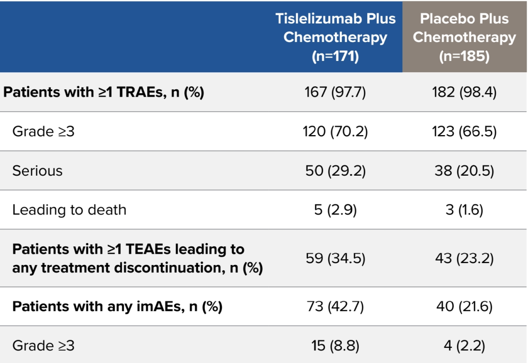 在安全性和耐受性方面,替雷利珠单抗联合化疗组较安慰剂联合化疗组具有更高比例的≥3级及严重治疗相关不良事件(TRAEs),主要为中性粒细胞计数减少(35.1%vs 31.9%)、白细胞计数减速(12.3%vs 17.8%)和贫血(13.5%vs 11.4%),发生率与同类治疗方案的经验相符,未出现预期之外的安全性信号,总体可预期和可管理(表3)。