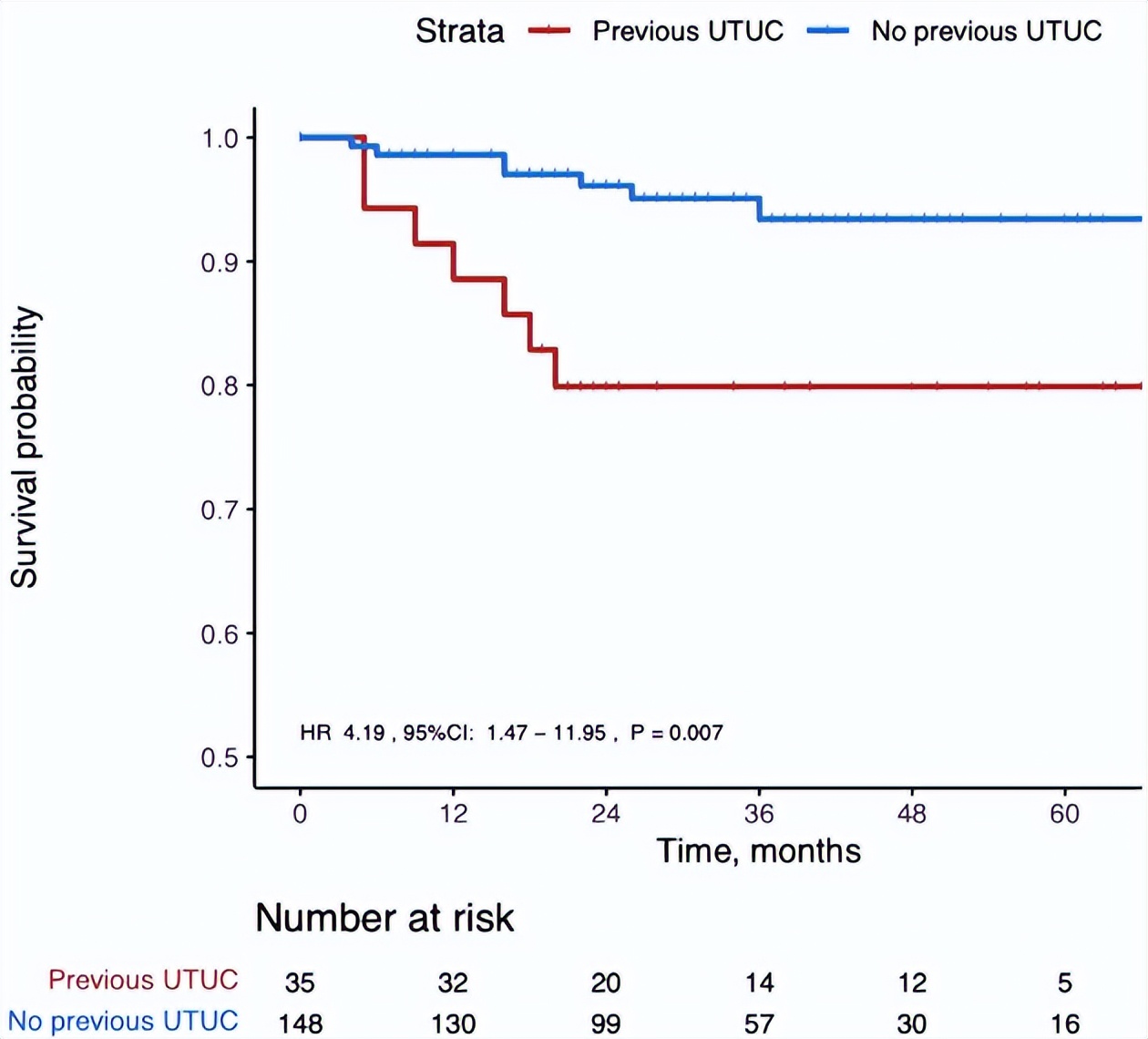 在非匹配分析中,异时性NMIBC与膀胱内高危复发风险增加相关,多变量分析显示,异时性NMIBC亚组复发率为54.3%,而原发NMIBC亚组复发率为28.4%(P=0.012,HR 3.12)。组间复发平均时间相似(异时性NMIBC亚组为11.2个月,原发NMIBC亚组为13.2个月,P=0.548)。除了既往UTUC病史外,多变量分析显示,其他复发高危因素包括EAU风险评分高(P=0.047,HR 2.84)和未能继续维持BCG治疗长达6个月(P=0.009,HR 5.49)。此外,异时性NMIBC亚组中有10例患者(28.6%)最终进展为MIBC,显著高于原发NMIBC亚组,后者仅有7例患者(4.7%)出现疾病进展(P=0.007,HR 4.19)。异时性NMIBC亚组也显示出更高的远处转移进展率(20%vs.6.5%,P=0.017,HR 3.33)。在非倾向匹配分析中,总生存率无显著差异(8.6%vs.18.4%,P=0.248,HR 0.44)。