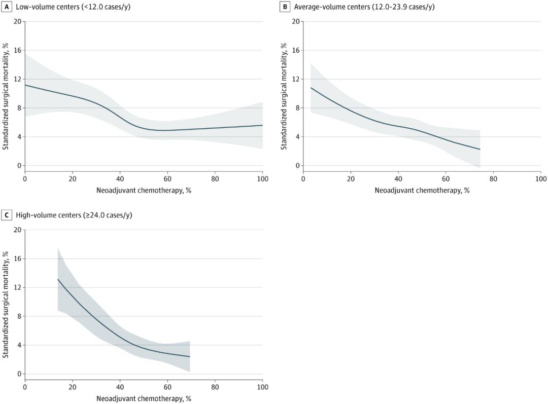研究结果展示了接受手术患者的90天手术死亡率与医疗中心新辅助化疗使用率及年均手术量级的关系(图2)。90天手术死亡率随新辅助化疗使用率上升和医院手术量增加呈下降趋势,同时具备高新辅助化疗使用率与高手术量的中心90天死亡率最低。然而在低手术量医院中,当新辅助化疗使用率超过某一临界值后,继续提高使用率似乎不再显著降低死亡率。
