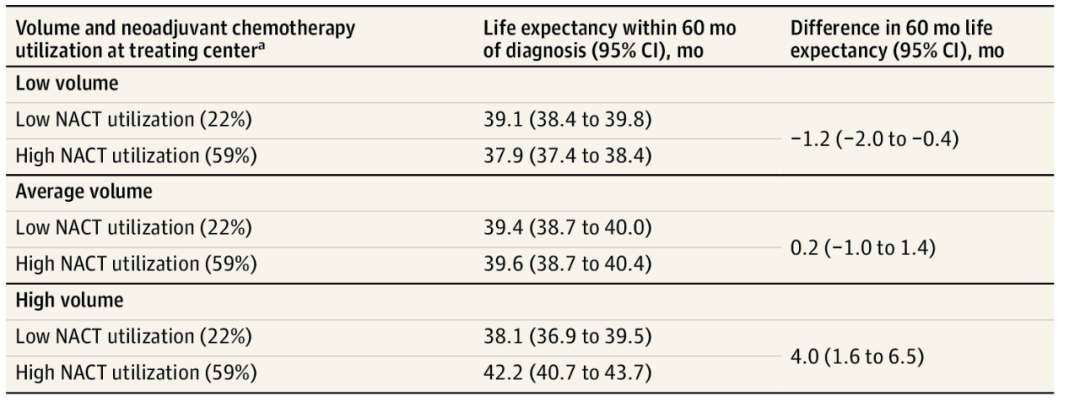 在高手术量且高化疗使用率中心治疗的患者,其60个月预期生存期较同级别低化疗使用率中心患者延长4.0个月。但在低或中手术量中心,高/低化疗使用率组的60个月生存期无显著差异(表1)。