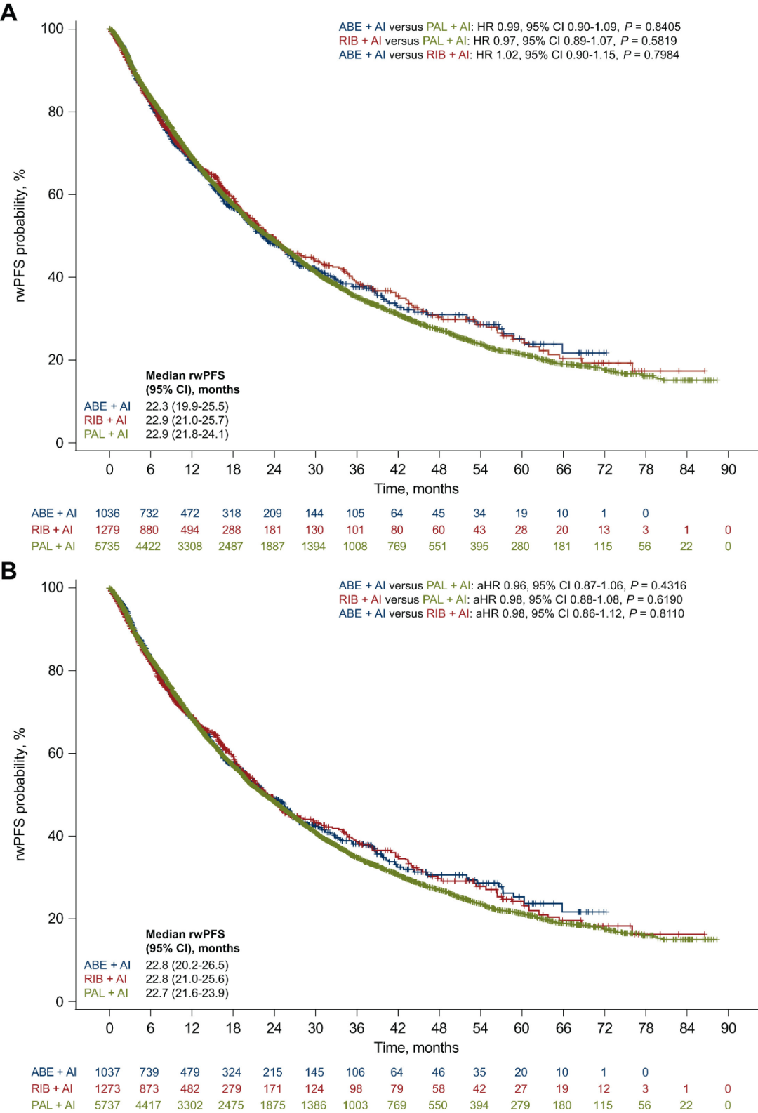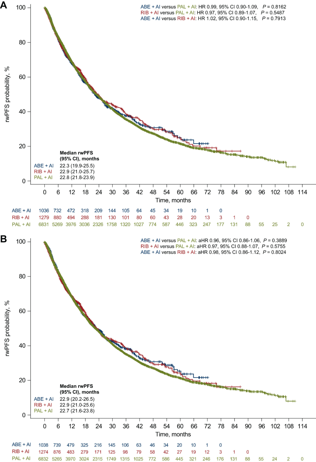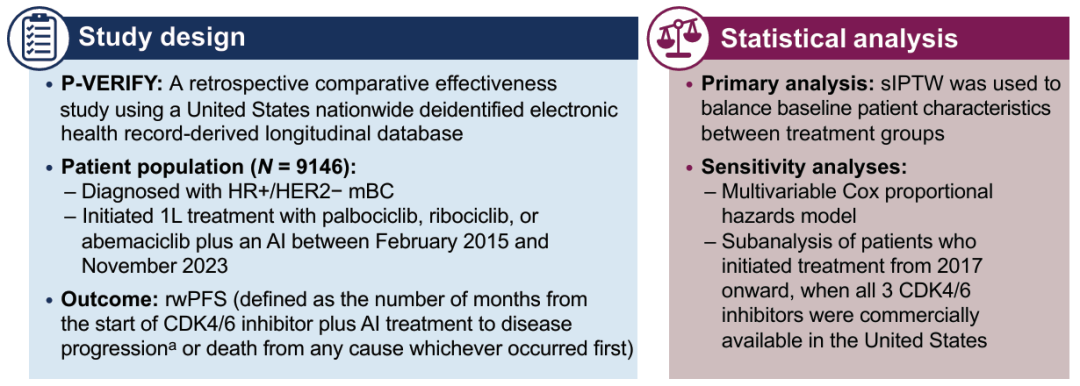 然而,目前仍缺乏直接头对头比较不同CDK4/6i疗效的RCT,既往真实世界研究也多因样本量有限、随访时间较短或rwPFS定义不一致而存在局限性。P-VERIFY研究是迄今对比CDK4/6i有效性的一项规模最大规模的RWS,其先前结果显示一线不同CDK4/6i联合AI的总生存期(OS)无显著差异。本研究旨在基于美国常规临床实践数据,进一步比较三种CDK4/6i联合方案用于HR+/HER2−mBC患者一线治疗的rwPFS。