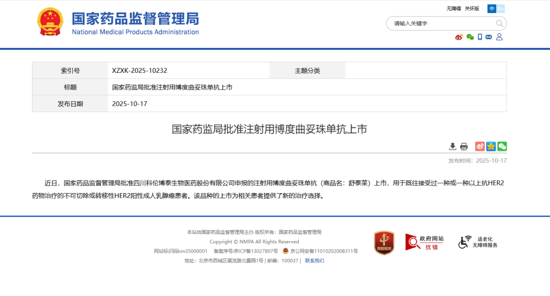 2025年10月17日,中国国家药品监督管理局(NMPA)正式批准中国创新HER2 ADC博度曲妥珠单抗(Trastuzumab botidotin/A166)上市,用于既往接受过一种或一种以上抗HER2药物治疗的不可切除或转移性HER2阳性成人乳腺癌患者。与此同时,博度曲妥珠单抗的Ⅲ期头对头研究KL166-Ⅲ-06(NCT06968585)结果,也在本届ESMO大会期间以最新突破性研究摘要(Late-Breaking Abstract,LBA)形式正式公布。