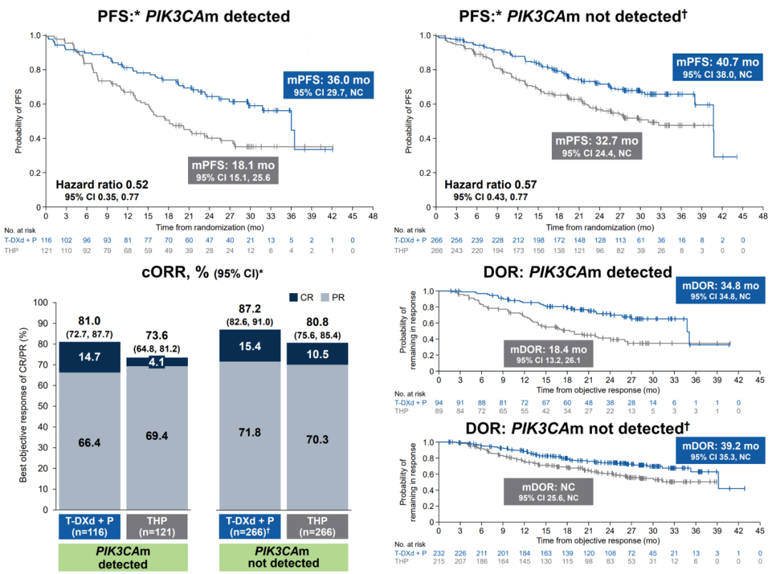 图5.PIK3CAm与非PIK3CAm人群的PFS、cORR、DOR