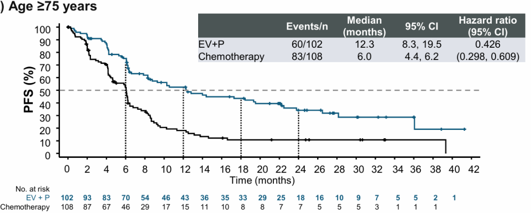 探索性分析结果显示[2],对于老年患者(年龄≥75岁),维恩妥尤单抗联合方案可使中位PFS较化疗实现翻倍,疾病进展或死亡风险降低57%(12.3个月vs 6.0个月,HR 0.43);可使中位OS较化疗翻倍,死亡风险降低49%(24.4个月vs 11.6个月,HR 0.51)。维恩妥尤单抗联合方案可显著改善ORR(66.3%vs 38.3%)和中位DOR(20.2个月vs 7.1个月)。