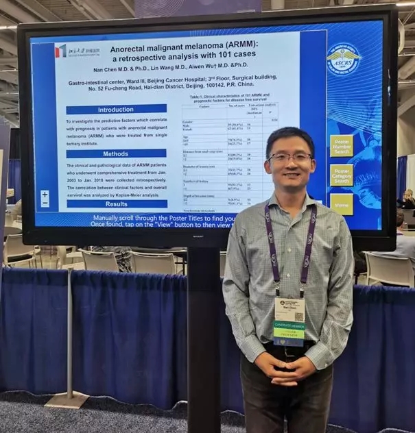 北京大学肿瘤医院胃肠肿瘤中心作为国内结直肠癌领域有着重要影响力的科室,在参与ASCRS有着多年的传统。此次年会由陈楠主治医师和陈鹏举主治医师分别带来的关于直肠恶性黑色素瘤题为“Anorectal malignant melanoma(ARMM): a retrospective analysis with 101 cases”和结直肠癌相关恶性肠梗阻题为“Short-term outcomes of palliative surgery for malignant bowel obstruction (MBO) caused by mCRC”的研究作为E-poster展示。