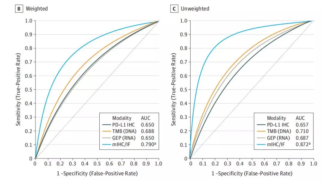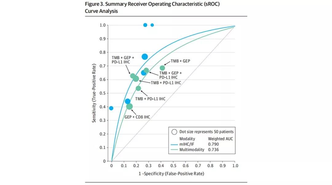 研究者多对8135例患者10多种实体瘤标本进行测定,结果与抗PD-1/PD-L1反应相关。当用sROC曲线评价每种检测方式时,mIHC/IF的AUC(0.79)显著高于PD-L1 IHC (AUC, 0.65, P<0.001)、GEP (AUC=0.65,P=0.003)和TMB (AUC=0.69, P=0.049)。当PD-L1 IHC和/或GEP + TMB等多种不同检测方式联合使用时,AUC更接近mIHC/IF(0.74)。所有的模式都显示出NPV和LR-相当,而mIHC/IF显示出比其他方法更高的PPV(0.63)和LR+ (2.86)。