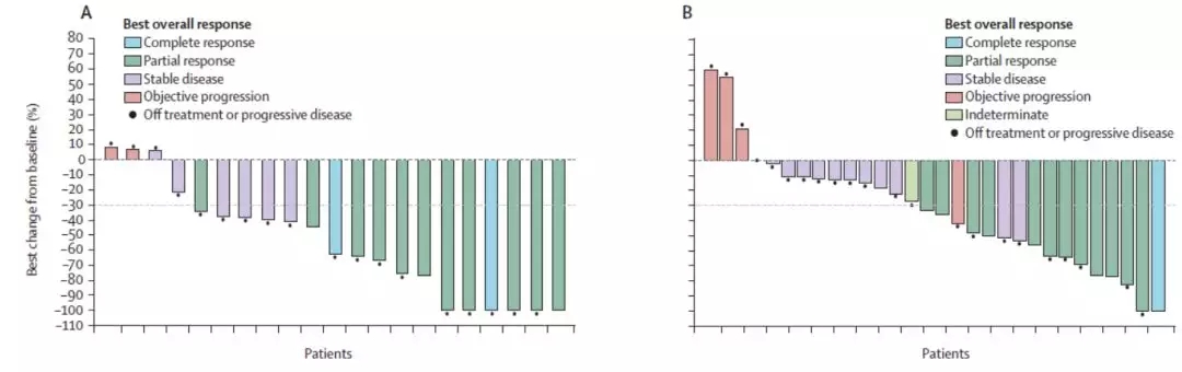 69例患者的总体ORR为41% (95% CI: 29-53%)。21例初治患者的ORR为62% (95% CI: 38-82%)(图1),中位反应持续时间为25.3个月 (95% CI: 7.5-31.9个月),有脑转移和无脑转移患者的ORR分别为45% (95% CI: 17-77%)和80% (95% CI: 44-98%)。40例既往仅接受克唑替尼治疗的患者,ORR为35% (95% CI: 21-52%) (图1),中位反应持续时间为13.8个月 (95% CI: 9.7-未达到),有脑转移和无脑转移患者的ORR分别为25%和50%。