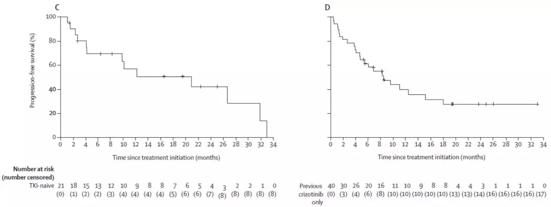末次随访时,62%的初治患者和58%的克唑替尼经治患者出现疾病进展,中位PFS分别为21.0个月 (95% CI: 4.2-31.9个月)和8.5个月 (95% CI: 4.7-15.2个月)。
