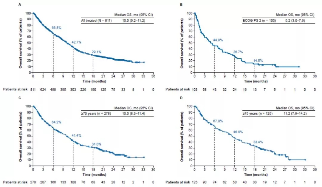 从疗效来讲,全组患者的中位OS为10.0个月(95% CI: 9.2-11.2个月),PS评分为2分、年龄≥70岁及年龄≥75岁患者的OS分别为5.2个月(95% CI: 3.0-7.6个月)、10.0个月(95% CI: 8.3-11.4个月)及11.2个月(95% CI: 7.9-14.2个月)(图4)。总体人群、PS评分为2分、年龄≥70岁及年龄≥75岁患者的12个月的生存率分别为42.7%、26.7%、41.4%和46.8%,18个月的OS率分别为29.1%、14.5%、31.0%和33.4%。