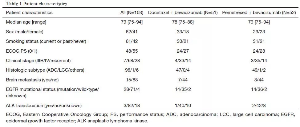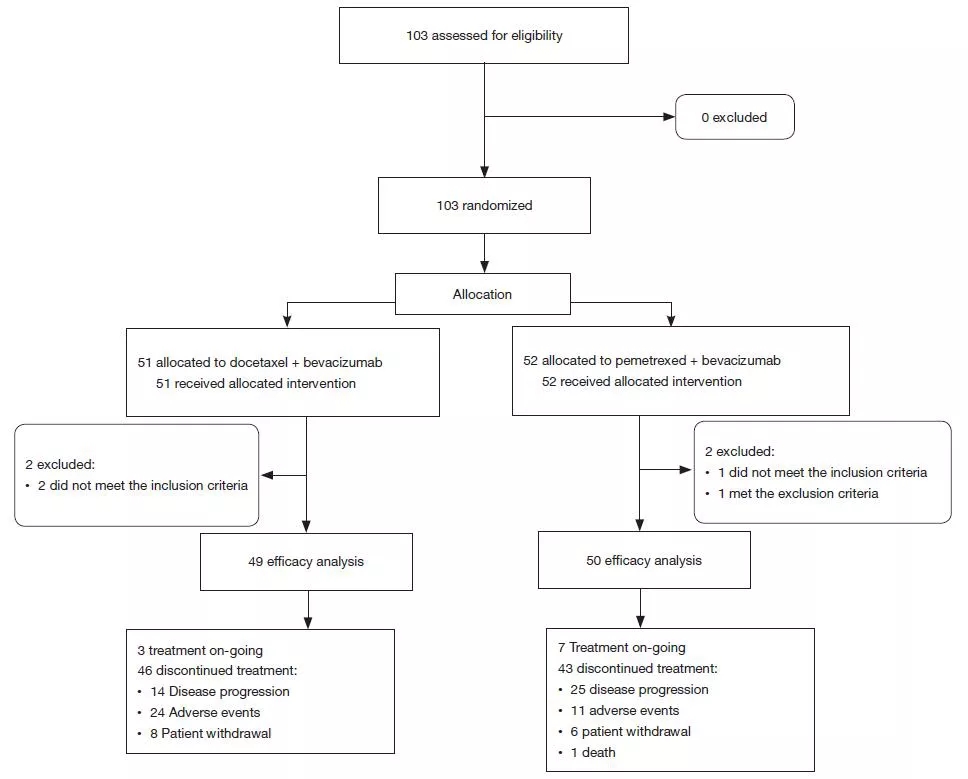 本研究从2014年10月至2017年5月进行患者入组,但由于入组时间过于缓慢,研究被提前终止,最终共计103例患者入组。多西他赛和培美曲塞组分别入组51例和52例患者。但4例患者排除疗效分析,其中3例不满足入组标准,1例出现方案违背,最终两组分别有49和50例患者纳入全分析集(图1)。