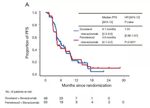 多西他赛和培美曲塞的中位治疗周期数分别为5和7.5周期,相对治疗剂量强度分别为82%和94%。贝伐珠单抗治疗周期数分别为5周期和6周期,相对剂量强度分别为98%和96.5%。全组患者中位随访时间为11.2个月,数据分析时,77例患者出现疾病进展,多西他赛组和培美曲塞组的中位PFS分别为6.1个月和4.6个月(HR=1.03; 95% CI: 0.66–1.61),6个月的PFS率分别为50.6%和43.9%,12个月的PFS率分别为23.1%和24.9%(图3)。