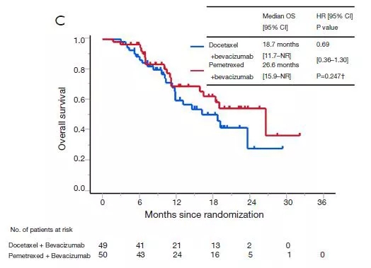 数据分析时,共计39例死亡事件出现,多西他赛组和培美曲塞组中位OS分别为18.7个月和26.6个月(HR=0.69; 95%CI: 0.36–1.30; P=0.247),1年OS率分别为60.5%和69.7%(图4)。