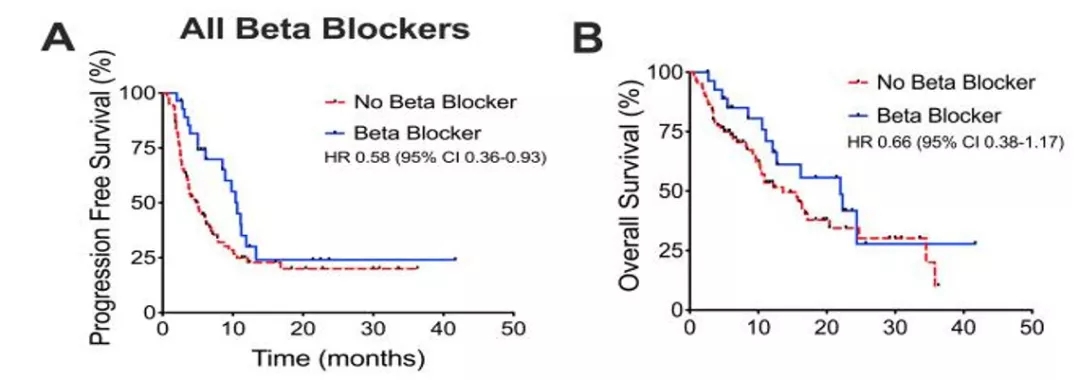 经过中位12.3个月的随访后,研究发现同时口服β-受体阻滞剂与PFS增加有关,可以将疾病进展风险降低42%,OS差异没有达到统计学的显著性(HR=0.66, 95% CI: 0.38-1.17)。