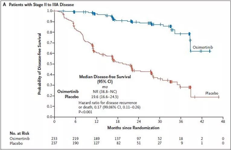 在携带EGFR敏感突变的1b-3a期非小细胞肺癌患者,接受奥希替尼术后辅助治疗较安慰剂可显著改善患者的远期生存。