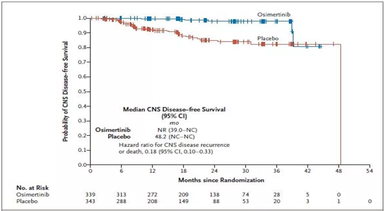 两组分别有2%和11%的患者出现中枢神经系统相关性的疾病,其中,1%和10%的患者出现中枢神经系统疾病复发。24个月时,奥希替尼组和安慰剂组分别有98%和85%的患者仍然存活且没有中枢神经系统相关的疾病(HR=0.18),即奥希替尼可降低颅内转移风险或复发风险达82%。中位无中枢神经系统疾病时间分别为未达到和48.2个月。数据截止时,全组只有29例患者出现死亡,奥希替尼组和安慰剂组分别有9例和20例患者(图5)。