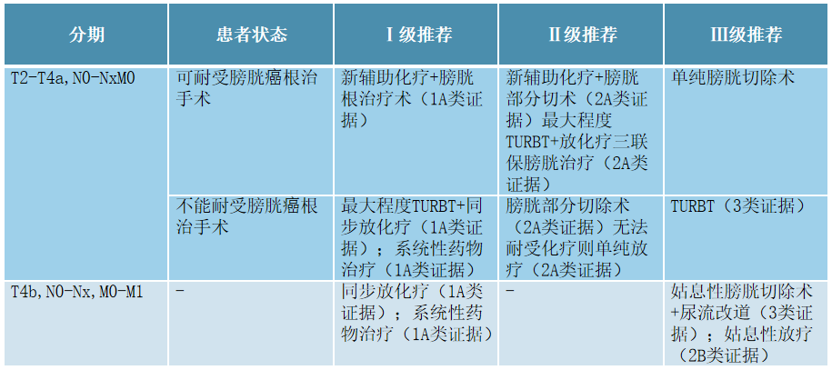 对于可耐受膀胱癌根治术的MIBC患者,“指南”推荐给予术前新辅助化疗(GC方案,5-8%的生存获益)联合根治性膀胱切除术;而不可耐受的患者,推荐行最大程度TURBT联合同步放化疗以及系统性药物治疗;T4b患者则推荐行同步放化疗以及系统性药物治疗
