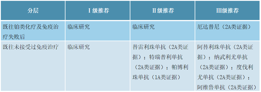 对于既往铂类化疗和免疫治疗失败的转移性膀胱癌患者,指南推荐行厄达替尼治疗(Ⅱa)。对于既往未接受过免疫治疗的患者,指南推荐行特瑞普利单抗(Ⅱa)、帕博利珠单抗(Ⅰa)以及替雷利珠单抗治疗(Ⅱa)。