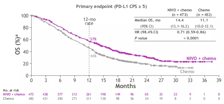 在PD-L1 CPS≥5患者中,纳武利尤单抗联合化疗组患者的中位OS达到14.4个月,绝对值超过传统化疗3.3个月(HR:0.71; 98.4% CI: 0.59-0.86; p<0.0001);