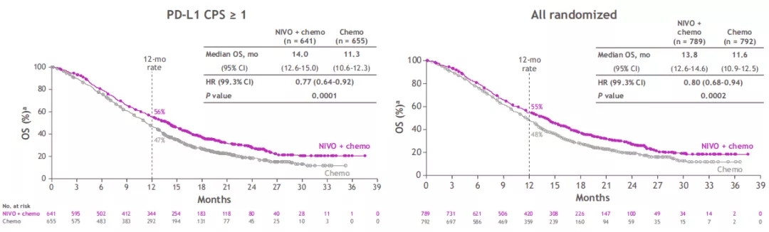 在PD-L1 CPS≥1患者中,中位OS延长2.7个月,纳武利尤单抗联合化疗组达14.0个月(HR:0.77;99.3% CI:0.64-0.92;p=0.0001);