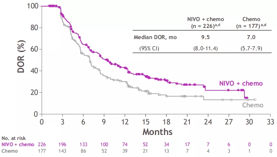 PD-L1 CPS≥5患者人群中,在获得60%客观缓解率的基础上,CheckMate-649研究更进一步体现了免疫治疗特有的“生存拖尾效应”,实验组的中位疾病缓解持续时间(DoR)达到了9.5个月;证明了免疫治疗一旦起效后,拥有更长疾病控制时间的优势。