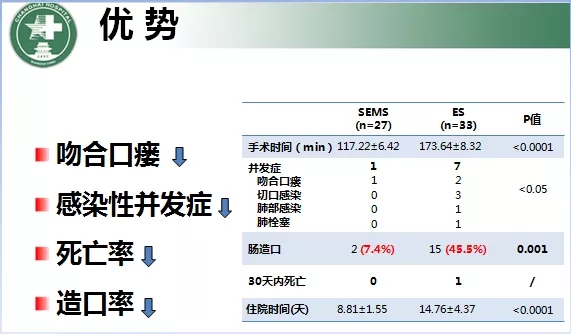 对于梗阻性结直肠癌患者而言,采用结肠镜下支架置入+腹腔镜下肿瘤切除(即双镜序贯治疗)具有诸多的优势,相比于其他传统治疗方案可减少治疗环节和病程,减少并发症及医疗费用。概括而言,其双镜序贯治疗的优势主要如下:①吻合口瘘发生率下降 ;②感染性并发症发生率下降;③死亡率及造口率下降。(图2)