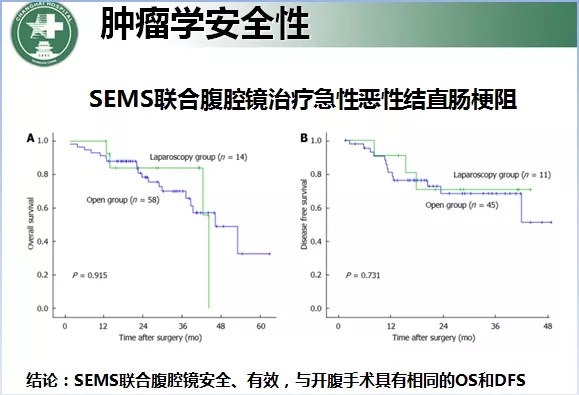 2015年World J Gastroenterol杂志上的一项研究比较了双镜序贯治疗和开腹手术对于梗阻性结直肠癌患者的疗效及安全性。结果表明,双镜序贯治疗安全有效,其总体生存(OS)及无病生存(DFS)与开腹手术无差异(图5 )。