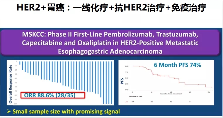 对于HER2阳性的晚期胃癌患者而言,化疗+抗HER2治疗+免疫检查点抑制剂的联合方案可使降期明显,病理学完全缓解(pCR)明显升高。在2019年ASCO会议上4011摘要的研究中,纳入37例Ⅳ期HER2阳性晚期胃癌患者,应用卡培他滨+奥沙利铂+曲妥珠单抗+帕博利珠单抗进行一线治疗,结果显示,其ORR可达88.6%,中位OS可达9.97月,6个月PFS可达74%。