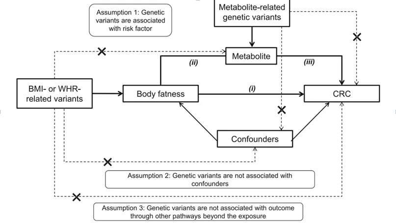 该大型研究由英国布里斯托尔大学和国际癌症研究机构的研究人员牵头开展。研究人员应用孟德尔随机化法,即使用基因信息作为体重的替代测量方法,调查不同的体脂测量方法对男性和女性结直肠癌风险的影响。下图为研究的目的和假设。